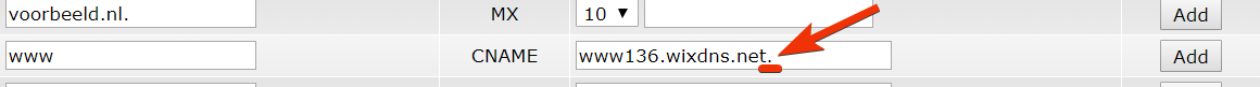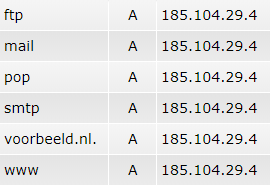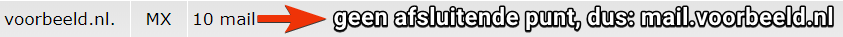 Zorg ervoor dat je de afsluitende punt gebruikt! Zonder deze punt voegt DirectAdmin automatisch jouw domeinnaam toe aan de record. Hierdoor wordt "www" in de record automatisch uitgelezen als "www.voorbeeld.nl".