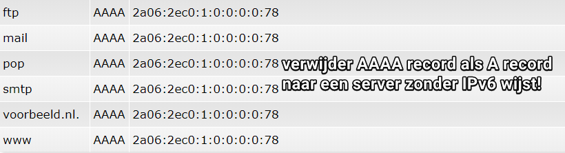 Als je met een A record naar een externe server wijst zonder IPv6-ondersteuning, moet je het bijbehorende AAAA record verwijderen. Anders kunnen sommige bezoekers namelijk via IPv6 verbinden en uiteindelijk bij onze server uitkomen.