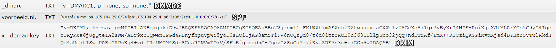 Ondanks dat TXT records geen actieve rol spelen, zijn er enkele records met een vaste functie voor de e-mailafhandeling, zoals DMARC, SPF en DKIM records.